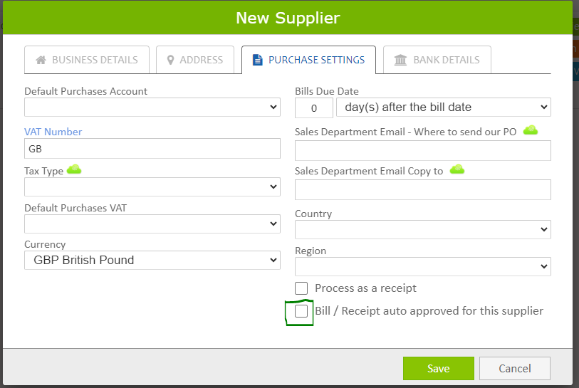 To send all purchase invoices / bills or credit-notes automatically to the bookkeeping software ensure the approval system is set to off in the settings section see below.